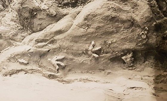 位于澳大利亚昆士兰中部一个火黏土洞穴的顶壁上,有好几组恐龙脚印。其中一些脚印每组四个,而且脚印不是陷入洞顶,而是向下浮出。几十年来它们让考古学家困惑不解。
