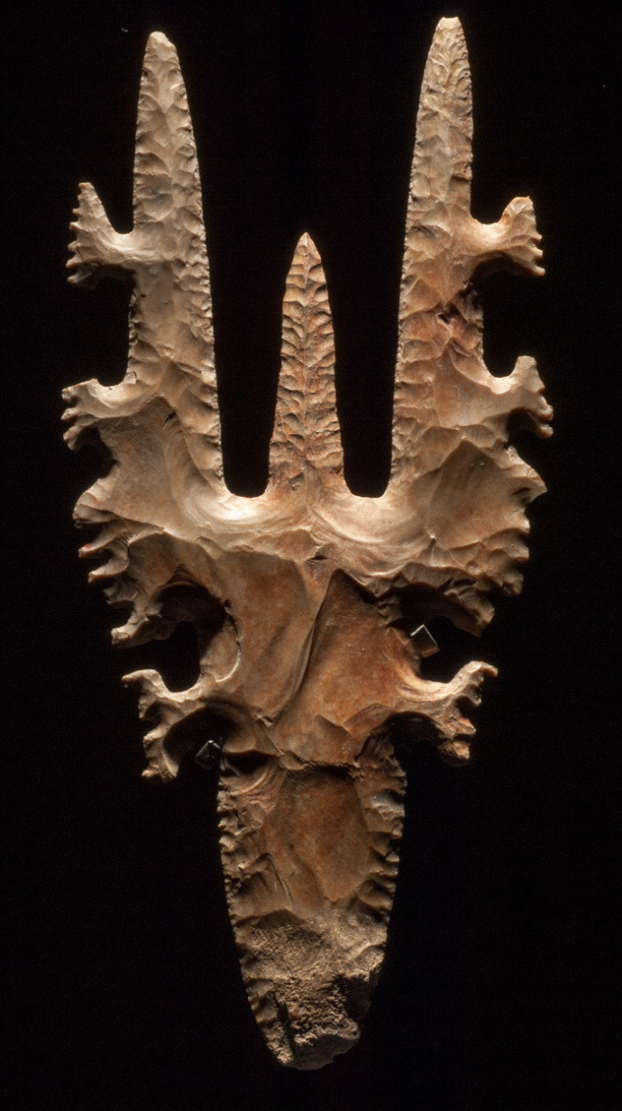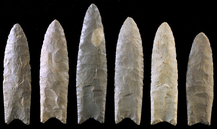 下图为1万年前北美洲克洛维斯文化的石制矛头,那时他们就已经用燧石磨成尖锐的矛头做为武器进行捕猎。