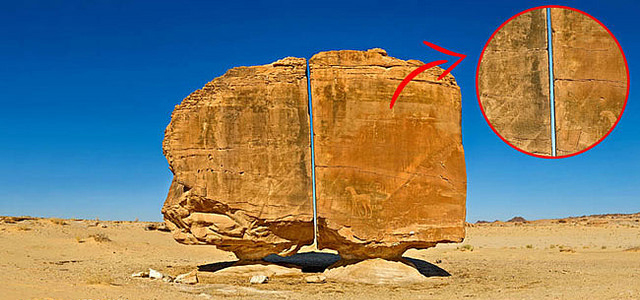 此岩石有完美的均衡状态,它由两个基石支撑着,最怪的事情是,它被完美地切成两半,这都意味着在某个时刻它一定曾受到极精密的工具切割过,有些人甚至大胆断定是像雷射切割机的工具。