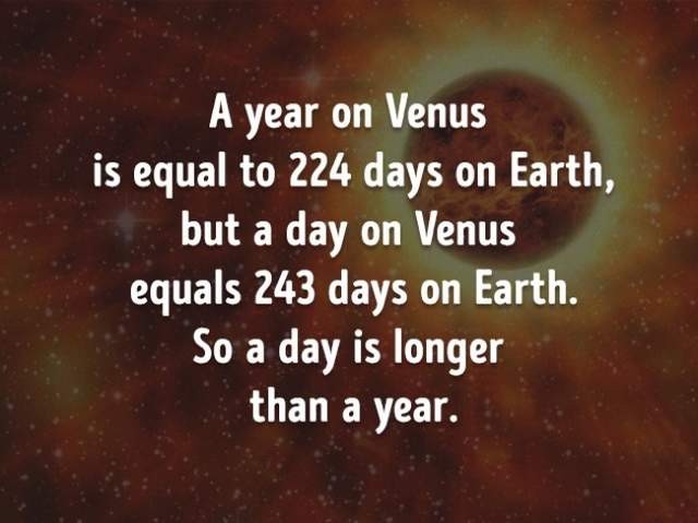 2. 金星的一年,约等于地球上的224天,但是金星上的一天,却等于地球上的243天,所以说一天比一年还长。(什么意思???)