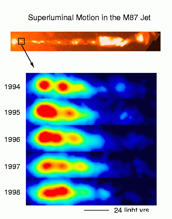 哈伯太空望远镜监视它在1995年至1999年之间的发展,而且经过4年的拍照后,他们看到电浆涟漪向外的速度比从黑洞发射的涟漪还快,意味着它的速度必定比光速快。在2013年,在经过13年的图像之后,它似乎以像是开瓶器形状的螺旋形在移动,使得这个奇怪事件更加令人困惑。