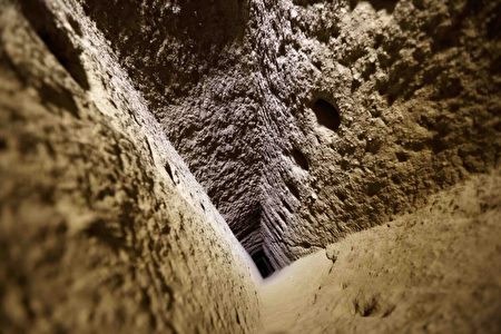 土耳其中部卡帕多细亚(Cappadocia)有一座庞大的地下城市。一名游客走过土耳其德林库尤地下城的一条通道。(Omar Haj Kadour/AFP via Getty Images)