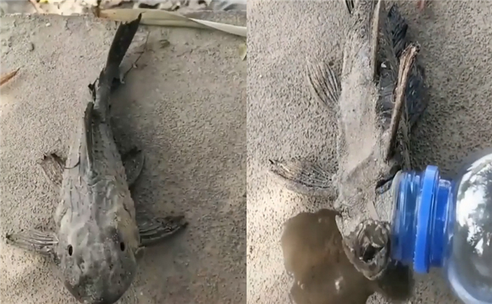 照理说鱼类离开水太久,会因为无法用鳃呼吸而死亡,不过网络上却疯传一段影片,只见一只已经干枯到近乎石化的鱼,在喝了一点水之后,立刻奇迹似的复活,奇葩画面让人看了啧啧称奇。