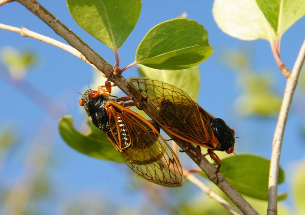 从土里钻出来后,它们会爬上树,然后蜕壳,慢慢获得一层黑亮和橙色的外壳。然后雄性就开始浪叫,求偶(有些人把叫声描述为“一艘外星飞船逼近的声音”)。