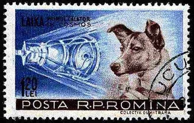 1959年的罗马尼亚纪念邮票,写着“莱卡,首位进入宇宙的旅行者。”