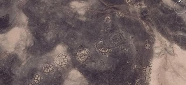 这些像是刻在地球表面的古老艺术,它们可以追溯到8500年前。这张照片中的车轮位于阿兹拉克绿洲,辐条朝向东南西北,可能与冬至日出一致。研究人员发现,轮子的设计各不相同,有些轮子显示出从中心辐射出来的辐条,有些轮子只有一两个杆而不是辐条,还有一些轮子根本不是圆形的,而是正方形、长方形或三角形,至今还无人破解其中的奥秘。