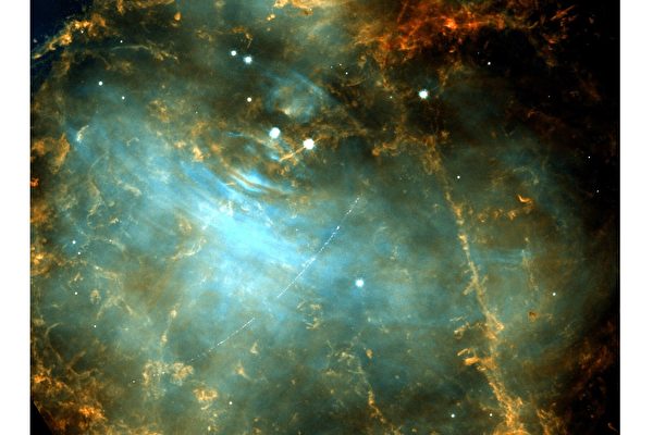 从处理后的照片上看到,一道白色的细长弧线从左下方划过五彩的蟹状星云,直到照片的右上方。蟹状星云是超新星爆炸后的残余物质团,位于金牛座,延绵5.5光年范围。对如此大范围的区域拍照,相比之下小行星太小了,很难发现它们的踪迹。