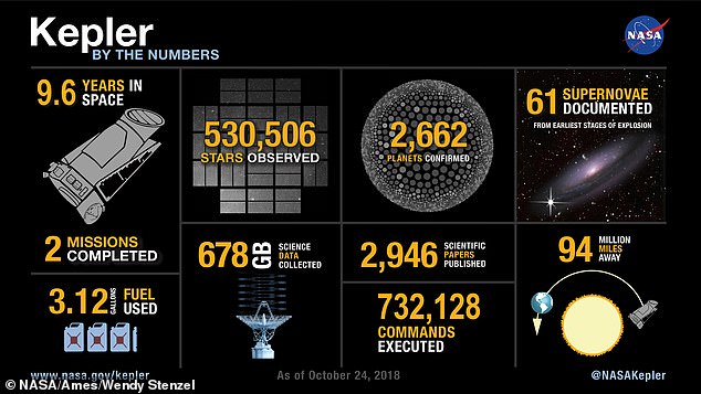 克卜勒太空望远镜 (Kepler) 于2018年10月退役,因为它用光了燃料,最初它设定的使用时间是3.5年,不过如果严格使用燃料,可以使用9年7个月23天。它的任务就是寻找天空中的天体,探索那些绕着恒星运动的行星,克卜勒太空望远镜也证明了银河系拥有的行星比恒星多。