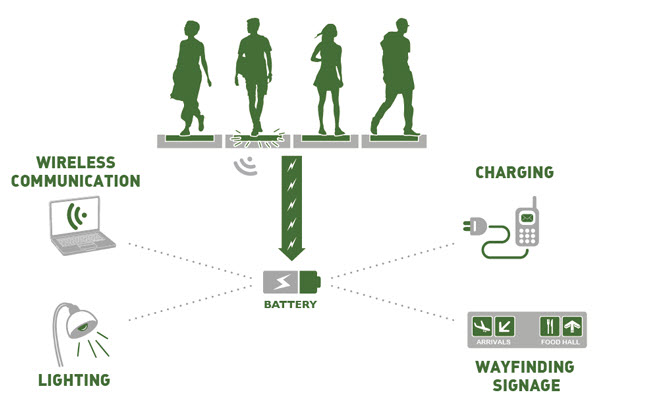 除了让特区的行人在走过人行道时会产生自己的环保电力,他们还可以透过嵌入在瓷砖中的无线应用程式介面将其脚步传输到金三角网站作为数位货币来生成数据。