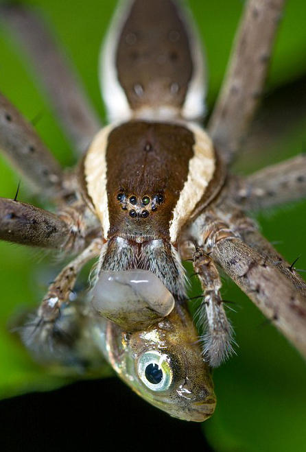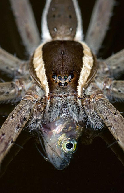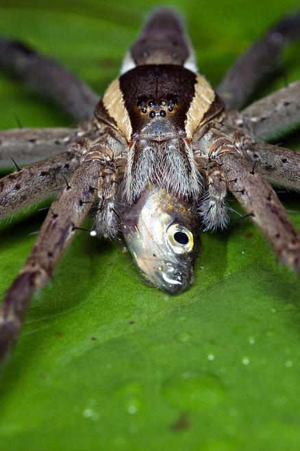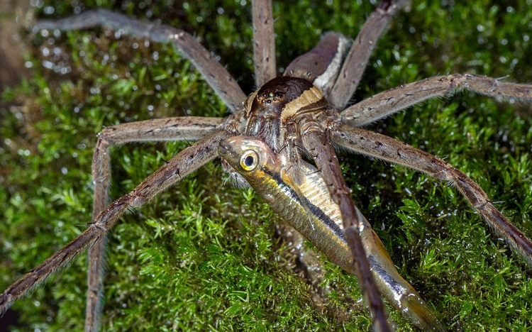 这些照片近距离地显示了一只水栖蜘蛛享用一整条鱼的过程,照片的清晰程度可能会让蜘蛛恐惧者们瞬间毛骨悚然。