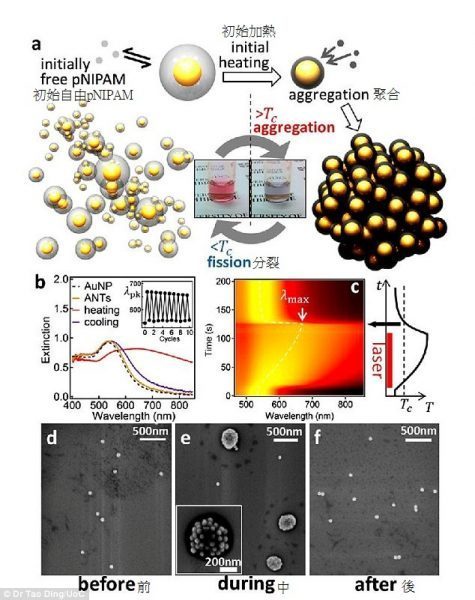 剑桥大学物理系卡文迪许(Cavendish)实验室的首席研究员 JeremyBaumberg 教授,说:“整个过程就像是一个纳米弹簧。这里聪明的部分是我们利用重金属颗粒的凡德瓦尔斯吸引力来设置弹簧(聚合物)和用水分子来释放它们,这是非常可逆性和可再现的。”