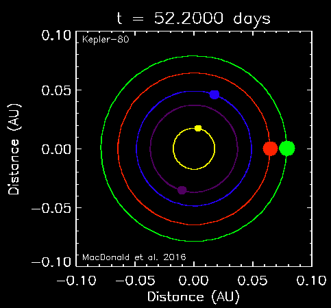 五颗行星紧靠其恒星运动,且相互之间极为靠近,使得开普勒太空望远镜能探测到它们由于相互间引力作用而引起的恒星年细微变化。
