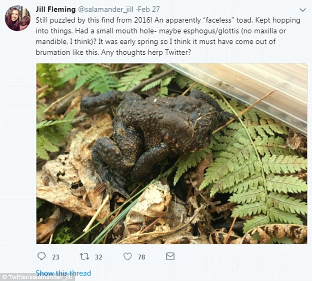发现这只蟾蜍的是麻萨诸塞大学阿默斯特分校的研究生吉儿 (Jill Fleming) ,她把无头蟾蜍的照片发到推特上,邀请科学家们发表见解,来解释为什么蟾蜍没有头却还能生存。