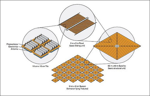 这个概念需要2500颗这样的卫星紧密的飞行在一起,形成了9平方公里(3.5平方英里)的太阳能发电面。 每个瓦片能够将太阳能转换成可传播的无线电能量,它可以被射(也可接收)到地球上。