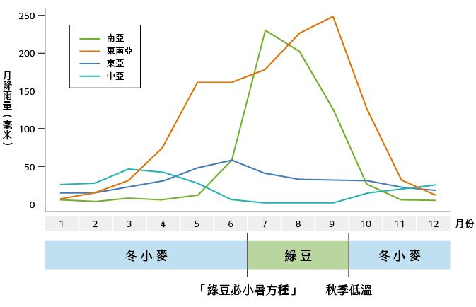 图四、现代中亚作物栽培的时程与绿豆四个族群原生地的月平均降雨量。由于主要作物(冬小麦)生长期、日照长度、与秋季低温的影响,在亚洲北方仅有短短几个月适合种植绿豆,且中亚在这几个月是干季,更加需要相对耐旱、生活史短的绿豆品系。图/科学月刊 资料来源/李承叡