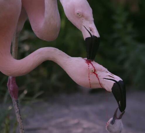 画面中可以看到,左边的火烈鸟似乎将尖尖的嘴“插进”另一只的头上,而那只仿佛“被破头”的火烈鸟则持续淡定的喂哺着幼鸟,一副什么事都没发生的样子。原来,这红色的液体并不是鲜血,而是一种叫做“鸽乳”的物体,其中一只火烈鸟在哺喂宝宝的时候,另一只也忙着分泌着鸽乳,只是全流到了另一半的头上。