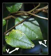 这两种叶子都长在同一根藤蔓上,一旦藤蔓变换宿主,它的新叶子就会变得与周围环境相差无几。在Gianoli拍摄的照片里,藤蔓的叶子被标记为V,树叶被标记为T。正如你看到的那样,你很难将它们区分开: