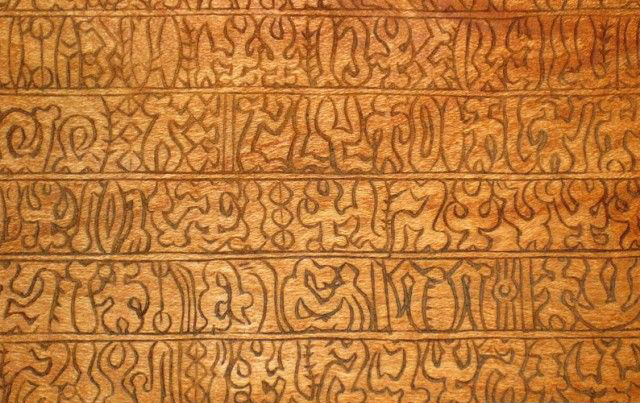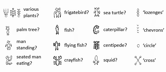真正的朗格朗格文字是以交替方向的方式书写,这种书写方式称作牛耕式转行书写法(Reverse Boustrophedon)。在木匾1/3的地方,文字刻在雕刻在木头上的浅槽中。这些象形文字本身是人类,动物,植物,人造物和几何形状的轮廓。很多人和动物图案头上都有一些特别的凸出,可能代表眼睛。’