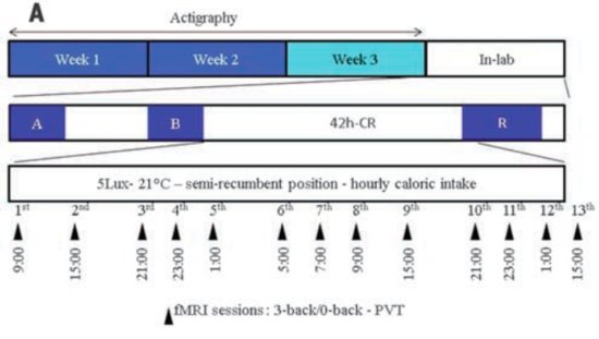 参与者们在睡眠剥夺实验前会在实验室睡两个晚上,分别用于适应实验室环境和睡眠基线测量,之后他们需要在5勒克斯照度21摄氏度的房间中待上42个小时(42h-CR)——不许睡觉。在这个过程中他们会经历12次fMRI扫描。而随后,他们能安心休息12个小时,再进行第13次fMRI扫描。