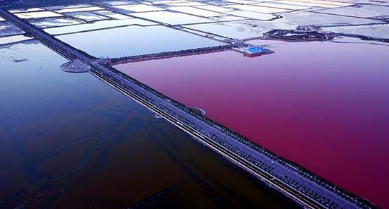 山西日报讯,运城盐湖继去年变身“玫瑰红”、今年5月份变为“七彩盐湖”后,近日又摇身一变为“鸳鸯锅”,引来了无数游客。所谓“鸳鸯锅”,是指在横贯盐湖的盐湖大道两侧,湖水一半呈现绿色,一半呈现罕见的玫瑰红。这一现象是怎么产生的呢?经检测,原来是杜氏盐藻在“作怪”。