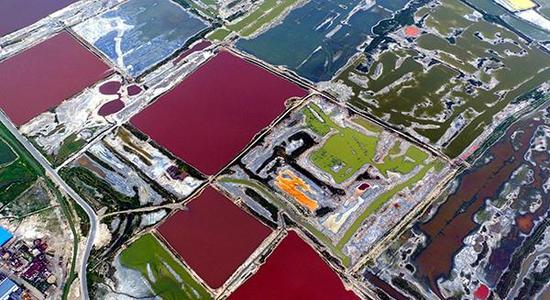 2016年9月26日,山西省运城五彩斑斓的盐湖航拍。 东方IC 图