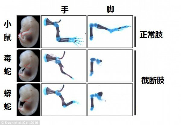 但是,插入小鼠的ZRS来自蛇类的时候,小鼠身体会发生明显的前后肢截断现象,说明这种身体变化的原因来自蛇类。