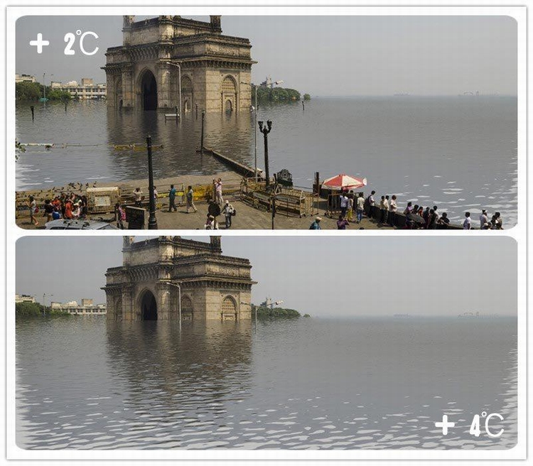 这是印度孟买气温升高2摄氏度和4摄氏度时,陆地淹没情况。