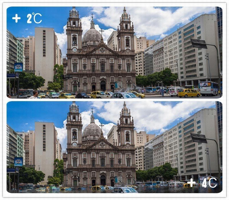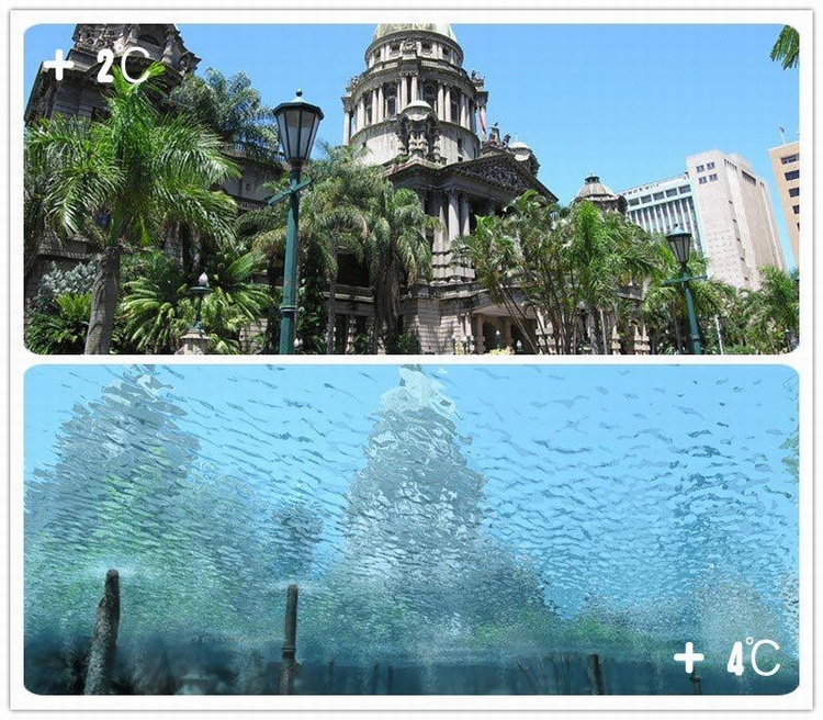 这份报告还随附了当平均气温升高2摄氏度和4摄氏度时,全球几大著名城市的景象。这是巴西里约热内卢气温升高2摄氏度和4摄氏度时,陆地淹没情况。