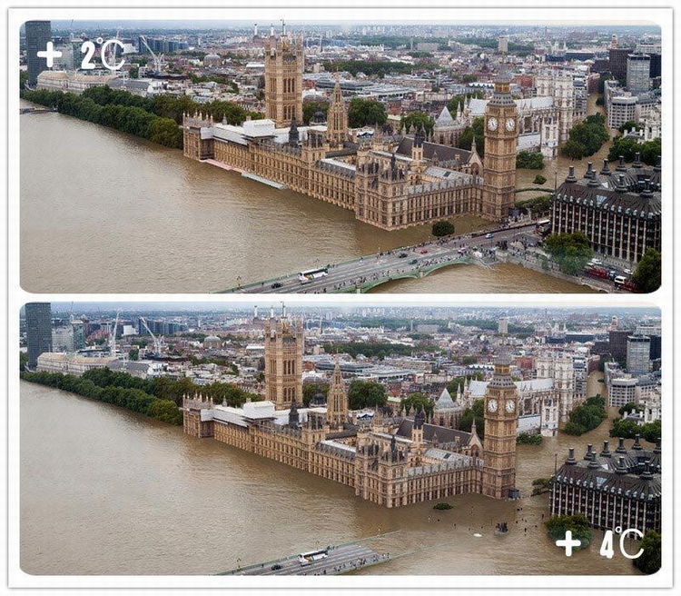 这是英国伦敦气温升高2摄氏度和4摄氏度时,陆地淹没情况。