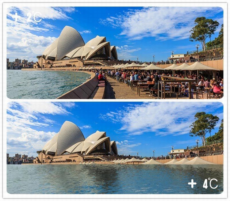 这些预测照片时时刻刻在告诉人们,2度和4度绝不是简单的小小数字,而是有可能使我们赖以生存的生态环境和家园发生翻天覆变化的巨大力量。这是澳大利亚悉尼气温升高2摄氏度和4摄氏度时,陆地淹没情况。