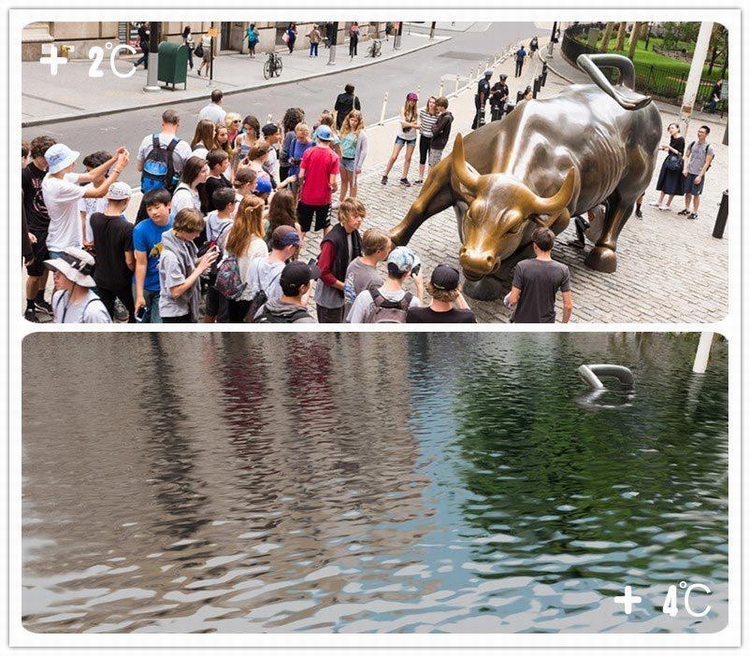 这是美国纽约华尔街气温升高2摄氏度和4摄氏度时,陆地淹没情况。