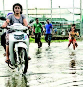 站在吐瓦鲁淹水的街道上。海平面上升已对当地造成威胁。