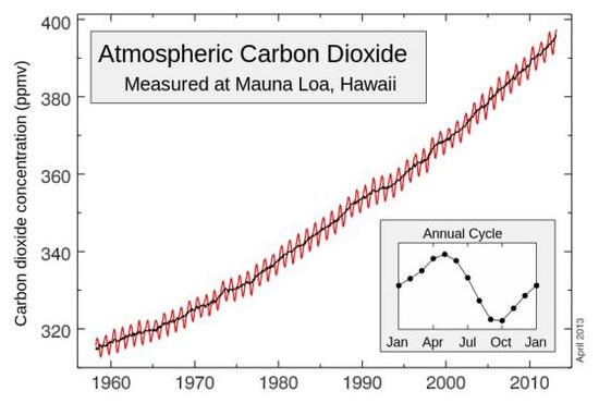 不久之后,另一位美国科学家查尔斯?基林(Charles Keeling)于1958 年,开始在偏远的夏威夷毛纳洛峰观测站,测量大气中的二氧化碳浓度。他的初步量测结果显示,二氧化碳浓度有很强的季节循环特性,每年夏天都会随着植物吸收二氧化碳而降低。不过到了1961 年,他已能指出二氧化碳浓度确实在稳定地上升当中。