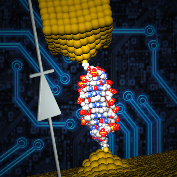 科学家插入一个名为coralyne的小分子到DNA,并且能创造出一个单分子的二极体,能够在未来的纳米电路上被用来当作1个主动元件: University of Georgia / Ben-Gurion University of the Negev.