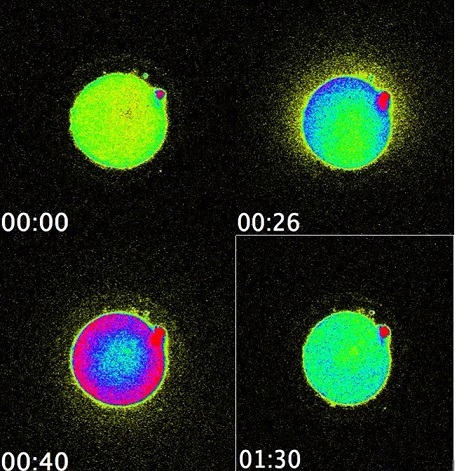以萤光拍摄精子酶进入卵子的刹那。图片来源:美国西北大学