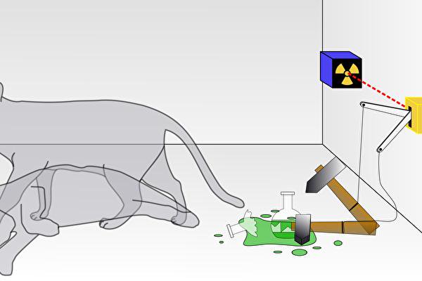 把一只猫、一个装有氰化氢气体的玻璃烧瓶和放射性物质放进封闭的盒子里。当盒子内的监控器侦测到衰变粒子时,就会打破烧瓶,杀死这只猫。根据量子力学的哥本哈根诠释,在实验进行一段时间后,猫会处于又活又死的叠加态。(维基百科)