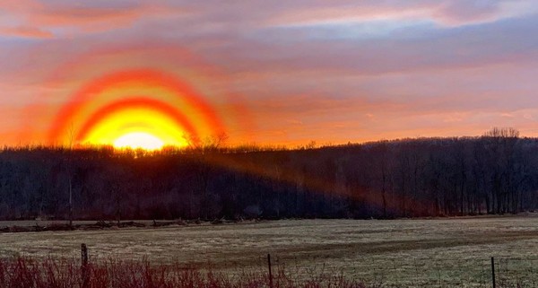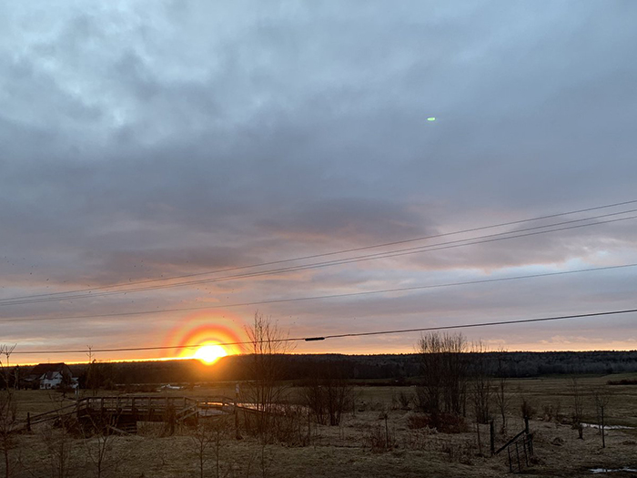 家住加拿大安大略省马尼图林岛(Manitoulin Island)的麦克诺顿(Christine McNaughton)在推特上发布了这张夕阳照,立刻吸吸引网友目光。半圆形的落日周围,环绕着3圈渐层光晕,就像是超巨型的橘色彩虹挂在远方的山边,麦克诺顿起初以为这是罕见的“幻日”(Sun dogs)现象,因此她决定联系专家与新闻媒体替这张美丽的照片解惑。