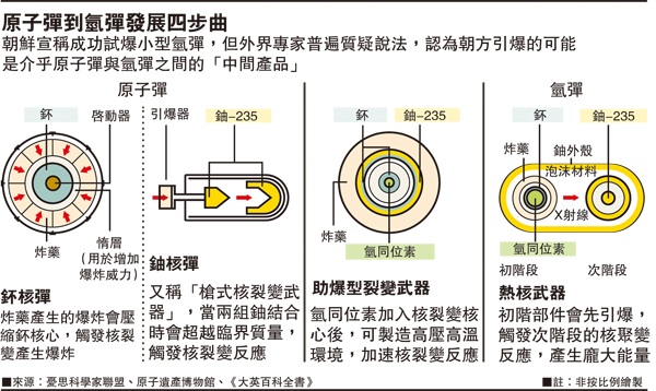 朝鲜的原子弹试爆要回溯到2006年、2009年和2013年。他们是使用核分裂来进行试爆,原子分裂变成更小的原子。