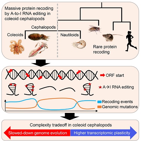 这些研究人员分析这些动物数十万个RNA记录地点,这些动物属于头足类动物的蛸亚纲(coleoid subclass)。他们发现,巧妙的RNA编辑在蛸亚纲动物的神经系统特别普遍。