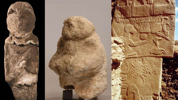 来自哥贝克力石阵的拟人描述。(A)故意断头的人类雕像(高60公分)。(B)礼物持有人手中握有一颗人头(高26公分)。(C)第43号柱(建物D),带有半浮雕的猥亵无头个体,一只手举起来(右下方)。