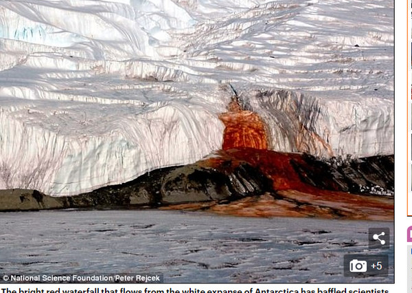 南极“泰勒冰川”(Taylor Glacier)有一处神秘的“血瀑布”,暗红色水流从雪白的冰川中流出,有如鲜血一般,科学家早在100多年前就发现这处奇景,但始终不清楚成形的原因,直到近日才解开谜底。