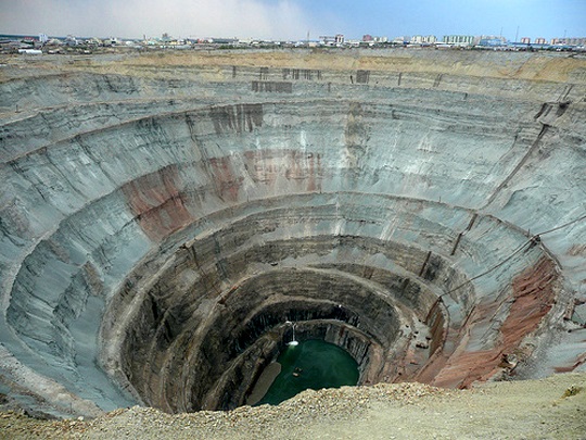 它又叫做钻石城,看起来像一个被陨石撞击的城镇。位于西伯利亚东方Mirny的Mir矿场,有1722英尺深,直径3900英尺长,而且它的钻石资源非常多,因此它使苏联从战乱之地、贫穷之国,变成第二次世界大战后期,当代全球的超强国。