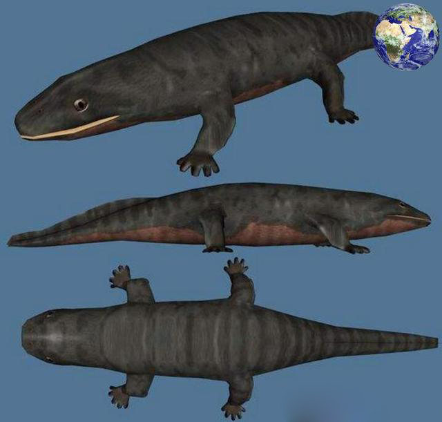 作为陆地脊索动物的祖先,海纳螈到底长什么样呢?通过电脑建模复原,这种动物的形象基本上被复原了出来。海纳螈有着扁扁的头和一口锋利的牙齿,一米五左右的体型算不上大。但科学家估计海纳螈的智商会比较高,有可能还要超过今天大多数的犬类。