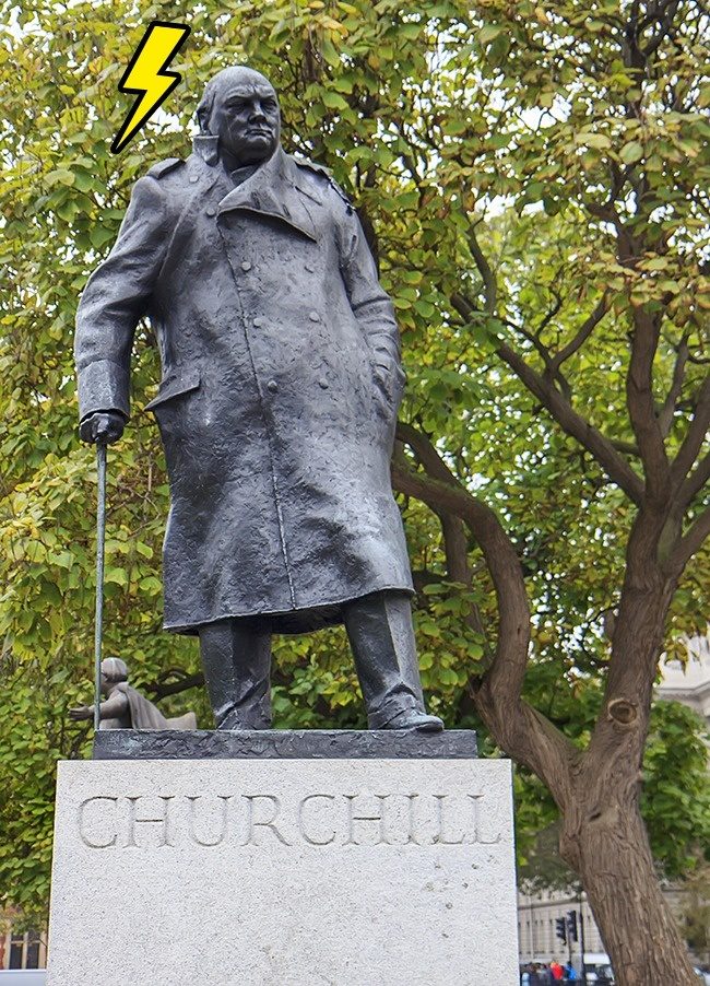 伦敦国会广场的邱吉尔雕像 (Winston Churchill) 有用微小的电流通电,以防止鸟儿坐在他的头上。