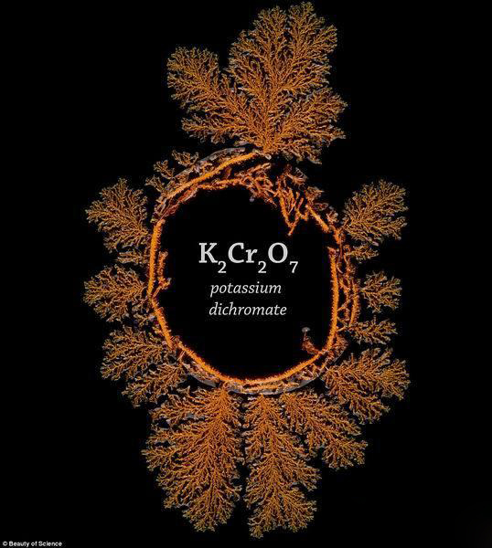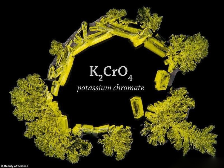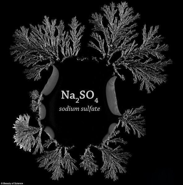 观察饱和水溶液液滴结晶化是非常单调的,但是一位教授非常认真地记录下来结晶化的整个过程,他认为这一自然反应是美丽的艺术作品。如图所示,晶体的颜色和结构形成微小的对称雪花结构。