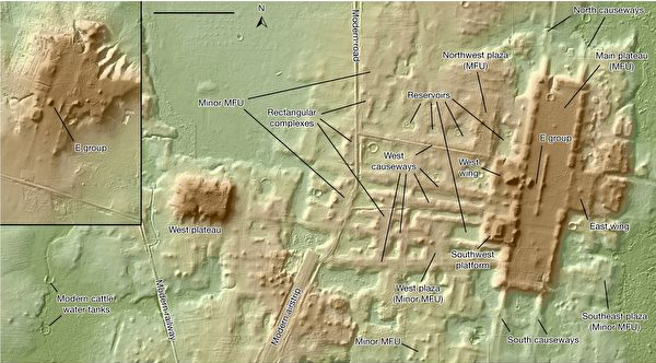 考古人员在塔巴斯科州(Tabasco)阿瓜达‧费尼克斯(Aguada Fénix)考古现场发现了一个长1,400米,高10至15米的人造建筑,有九条向外发散的堤道。
