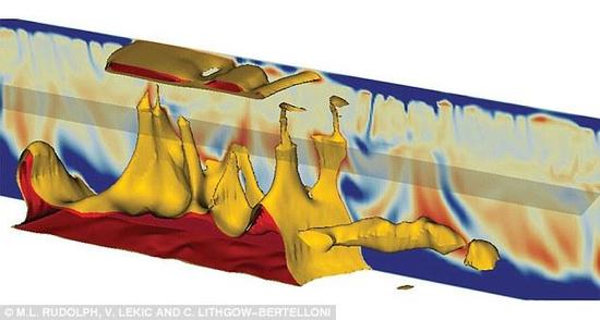 这个边界层处于悬浮移动状态,巨大的海洋板块俯冲到地幔下,地幔羽流从深处喷出,地幔热柱是向上流动的。但热柱通过1000公里边界时,许多的地幔柱被横向偏转,造成两侧物理性质的变化。
