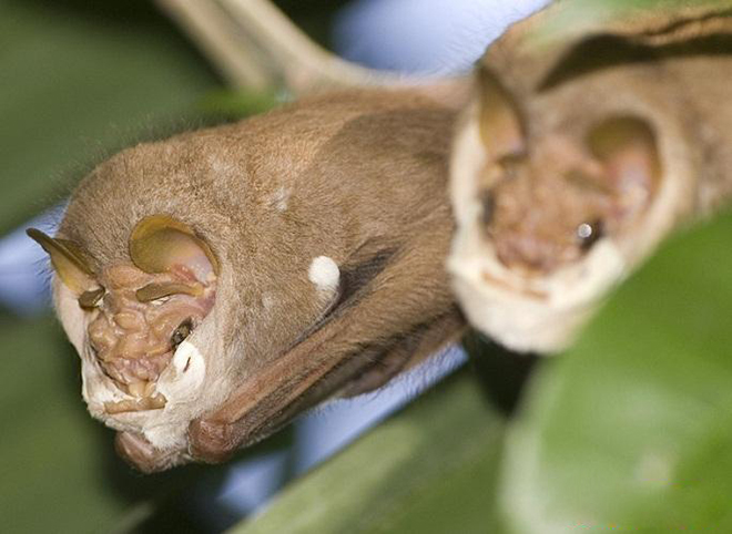 襞面蝠:中南美洲的襞面蝠拥有一种特别古怪的休息习惯:它能够将它古怪的皮肤褶皱整个覆盖在脸上。这种古怪的样貌似乎有助于它们长出异常强大的28颗牙齿,来享受那些美味水果。