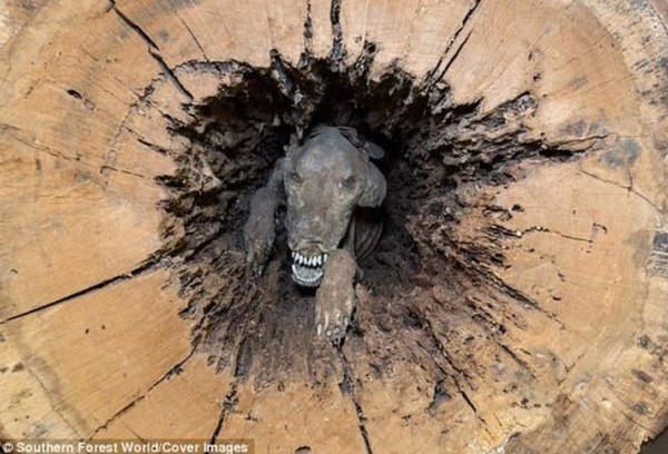 1980年美国一名伐木工人在森林中作业时,发现一棵被砍半的中空橡树,里面有一具猎犬干尸,专家认为它应该是在追捕猎物时不小心掉进洞里,被活活饿死,又因为树洞里环境特殊,才把狗狗最后的模样保存下来。
