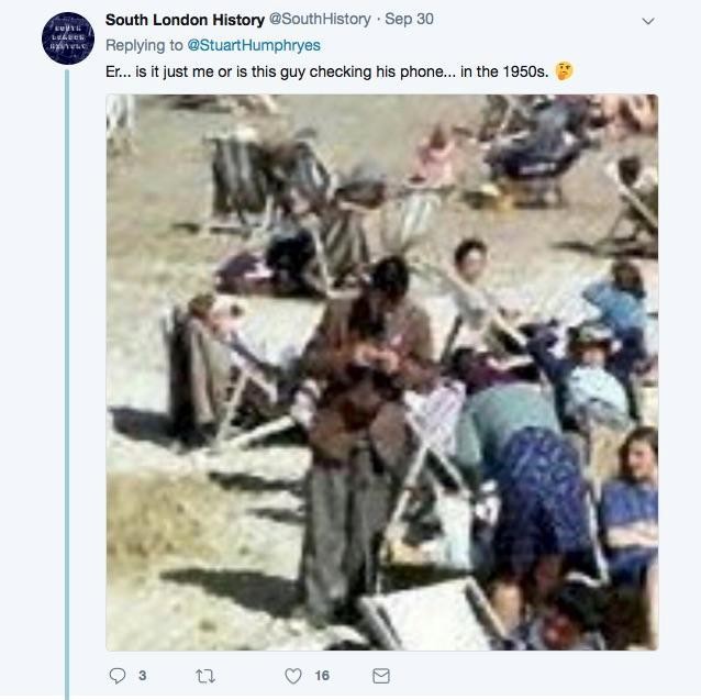 然而,倘若这张照片拍摄于1943年,手机其实是在30年后,也就是1973年,才被发明出来,网友们纷纷发挥想象力,“他该不会是时空旅人!”“他或许正在用GOOGLE定位,查看自己回到什么地方、什么年代。”“是我的错觉,还是他真的低头在看手机,这可是上世纪的照片啊!”